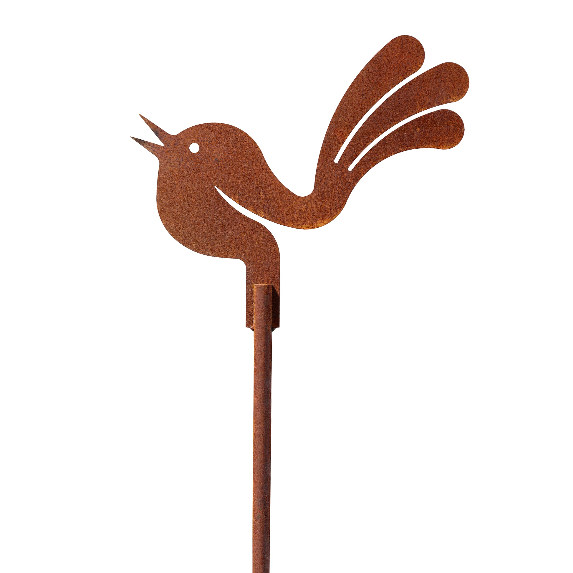 Unser drehbarer Vogel aus Cortenstahl ist eine besondere Gartendeko, die Eleganz und Leichtigkeit verbindet. Dank einer Kugel zwischen Vogel und Stab dreht sich die Figur bei (starkem) Wind oder kann händisch ausgerichtet werden. Aufgrund der Gewichtsverteilung richtet sich der Vogel auch nach dem Drehen immer wieder in die Nullposition aus.